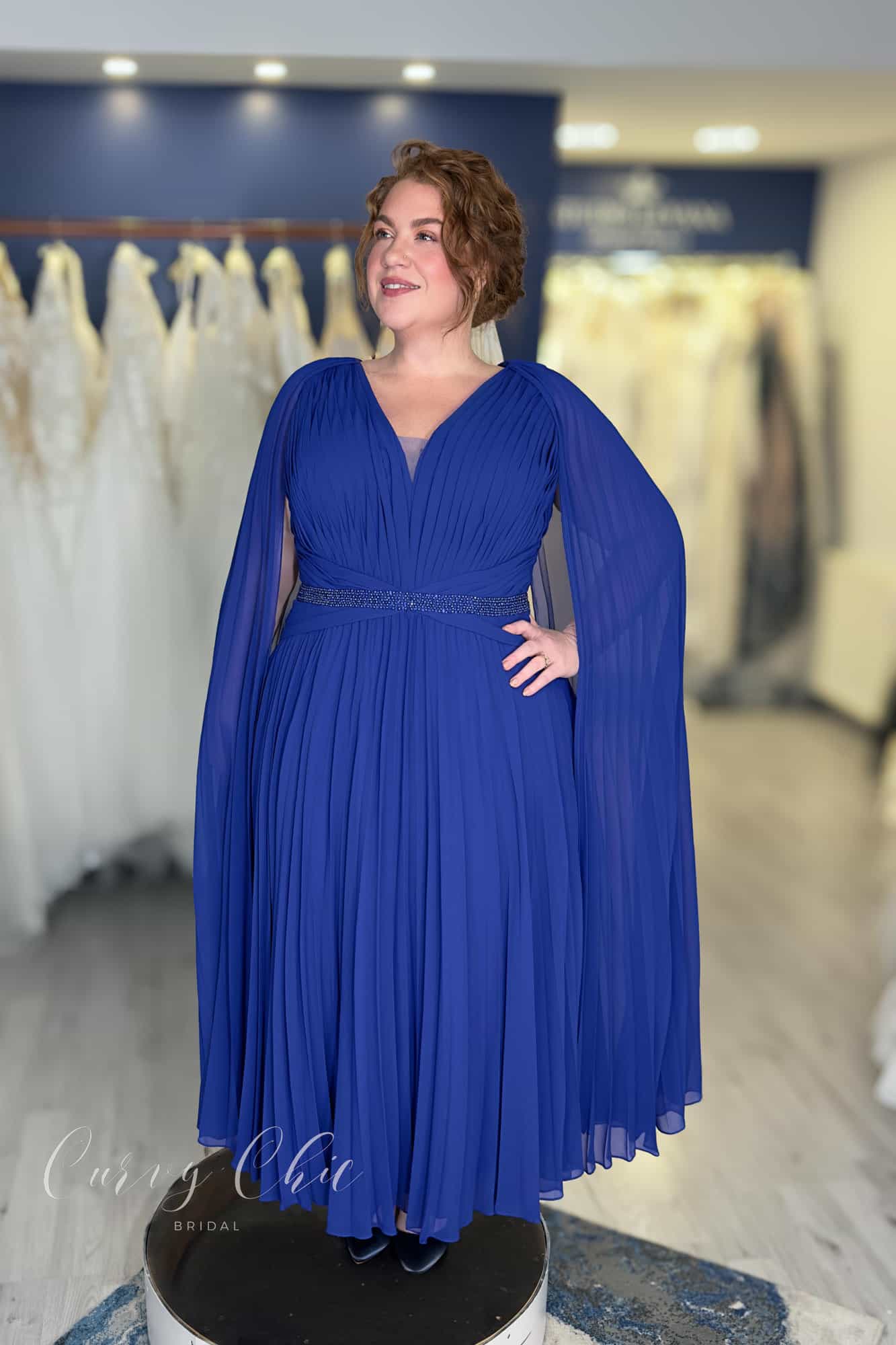 Veni Infantino Pleated Cape Sleeve Dress in Royal Blue